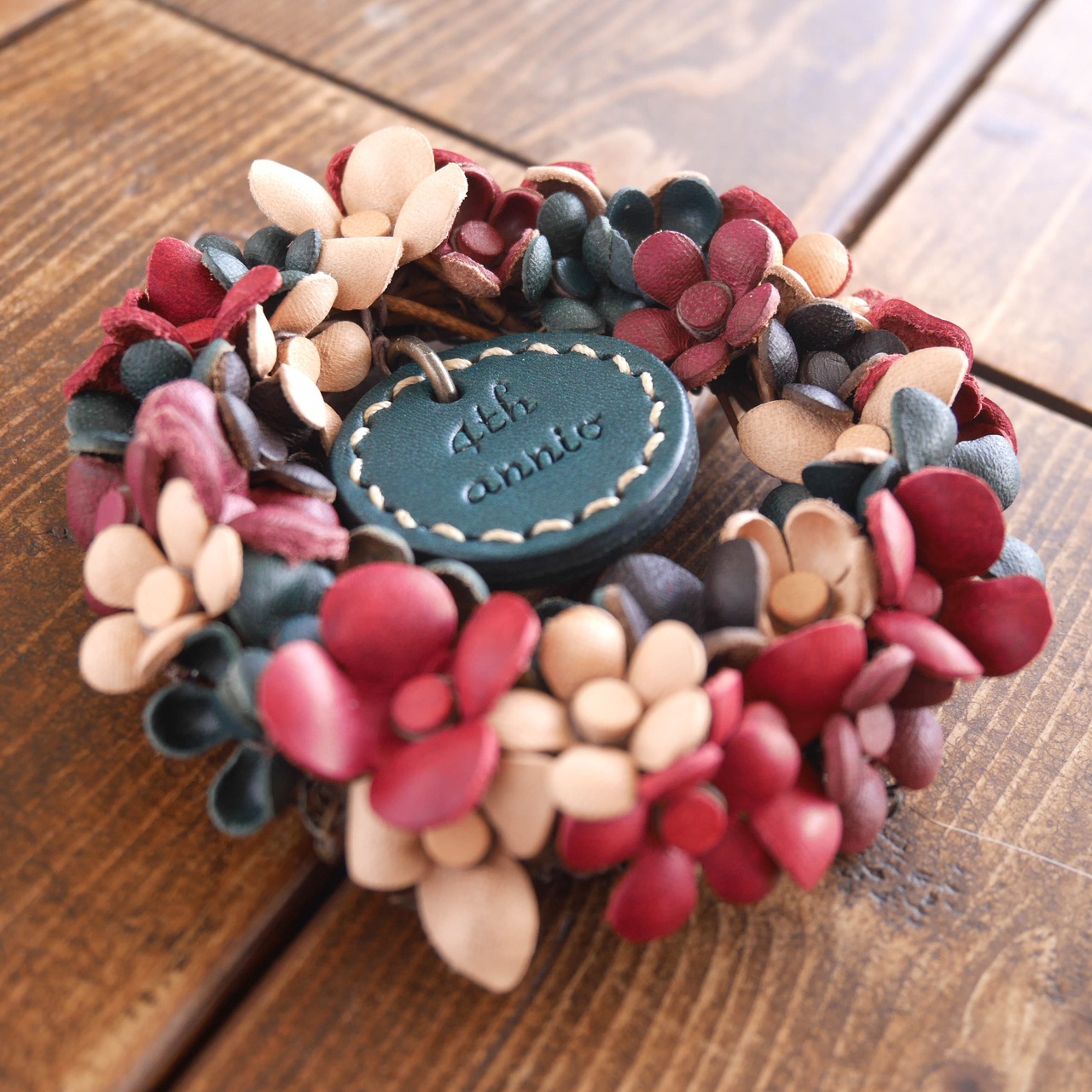 小さな革花のリースをベースに下記カスタムを施して制作致しました。